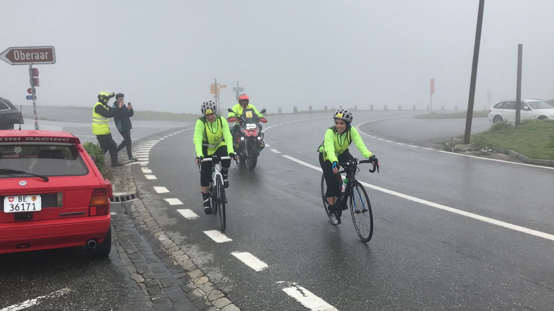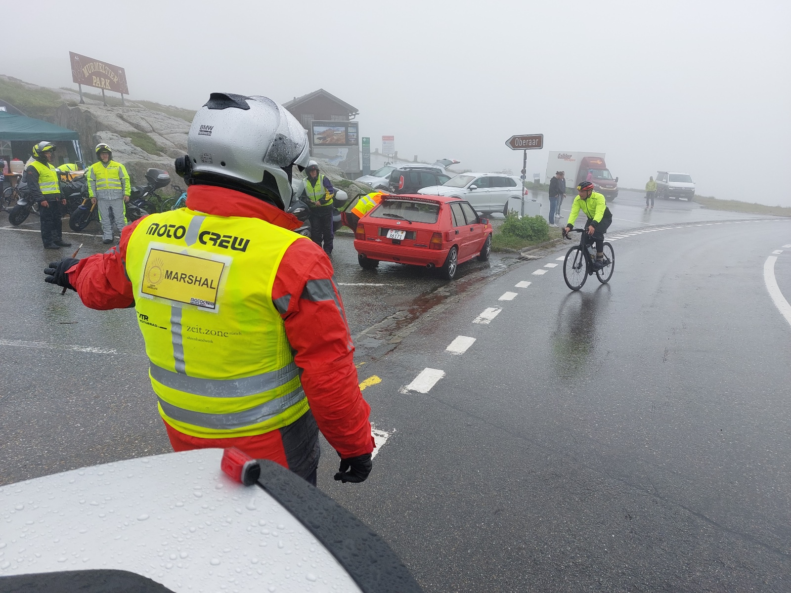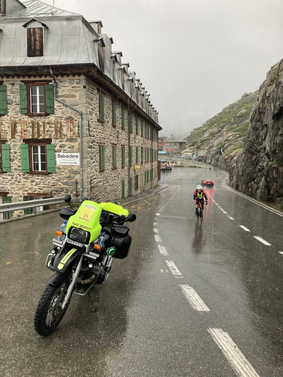 Dann schlug mal wieder die Stunde der motocrew und hat gezeigt zu welch ausserordentlichen Leistungen sie fähig ist. Marshals haben an allen Ecken und Orten den Verkehr geregelt, die Teilnehmer informiert, organisiert und die noch pedalenden Fahrer auf die Grimsel Passhöhe "gezogen". Die Krönung aber war, als einer unserer lokalen Töfflern in Absprache mit dem OK kurzerhand in Innertkirchen einen 40-Plätzer Bus organisierte und auch selbst steuerte, damit alle verbleibenden Rennfahrer vom Grimsel nach Andermatt chauffiert werden konnten!